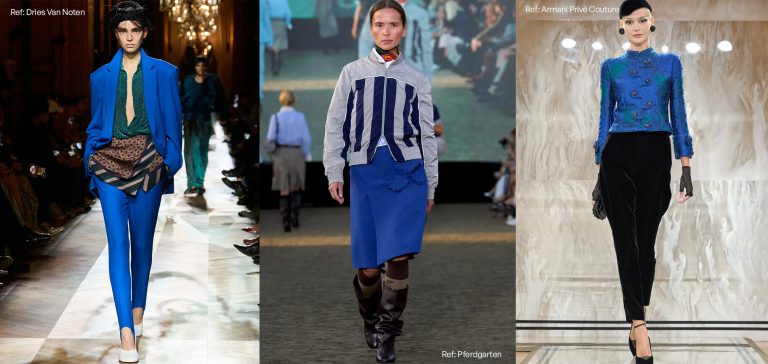 Sim! O azul cobalto já apareceu nas passarelas e vem se destacando como uma cor-chave. Combinando intensidade e versatilidade, essa cor transitou entre o minimalismo contemporâneo e o maximalismo, aparecendo tanto em looks monocromáticos quanto em combinações contrastantes com tons neutros ou metalizados.