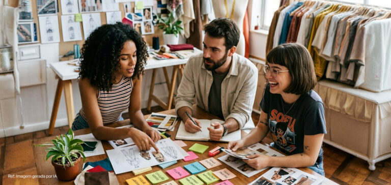 Primeiramente, o brainstorming é um dos caminhos mais simples e eficientes para encontrar boas ideias. Aqui, o objetivo não é acertar de primeira, mas gerar o máximo de possibilidades. E vale anotar tudo que tiver a ver com o tema: palavras soltas, sensações, referências visuais, lugares, músicas ou até expressões que tenham relação com o conceito da coleção.