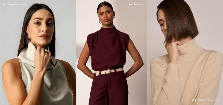 A gola alta é clássica, retrô e elegante, e remete imediatamente a artistas e intelectuais que marcaram época. Portanto, traz um ar contemplativo e sofisticado ao visual. Ao cobrir o pescoço, cria uma silhueta alongada e acolhedora, perfeita para dias frios ou composições de meia-estação.