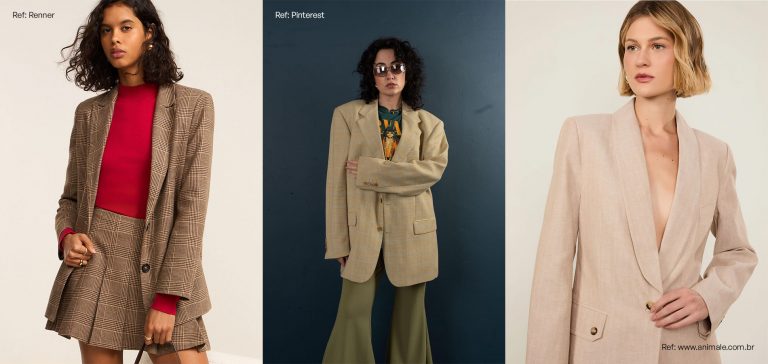 Normalmente oversized ou com caimento amplo, apresenta ombros estruturados, muitas vezes com ombreiras, e tecidos encorpados que reforçam sua presença.